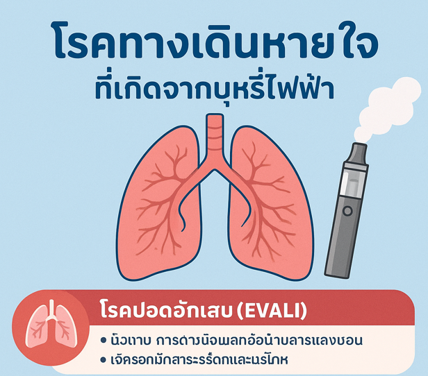 โรคทางเดินหายใจ ที่เกิดจากบุหรี่ไฟฟ้า 02/07/256808/09/2025admin adminสาระน่ารู้เครื่อข่ายพยาบาลเพื่อการควบคุมยาสูบแห่งประเทศไทย