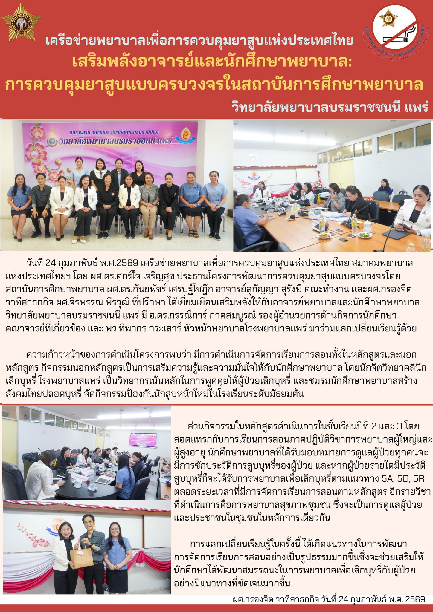 เครือข่ายพยาบาลเพื่อการควบคุมยาสูบแห่งประเทศไทย เสริมพลังอาจารย์และนักศึกษาพยาบาล: การควบคุมยาสูบแบบควบวงจรในสถาบันการศึกษาพยาบาล วิทยาลัยพยาบาลบรมราชชนนี แพร่ 26/02/256908/03/2026admin adminจดหมายข่าวเครื่อข่ายพยาบาลเพื่อการควบคุมยาสูบแห่งประเทศไทย