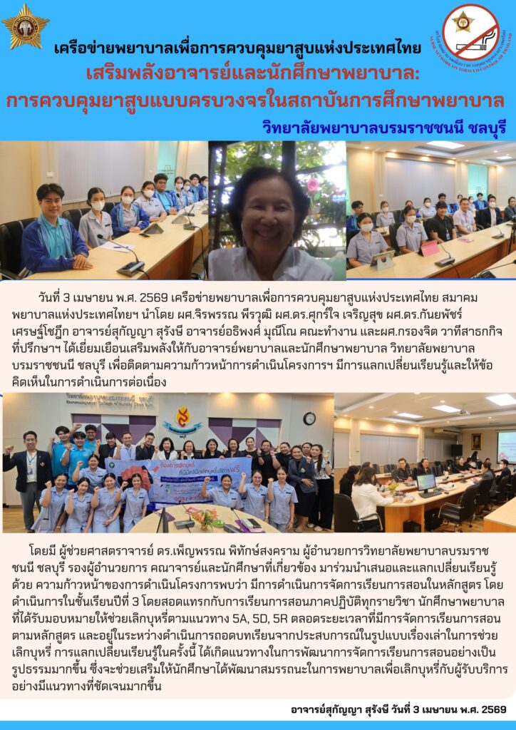 เสริมพลังอาจารย์และนักศึกษาพยาบาล: การควบคุมยาสูบแบบครบวงจรในสถาบันการศึกษาพยาบาล วิทยาลัยพยาบาลบรมราชชนี ชลบุรี 09/04/2026admin adminจดหมายข่าวเครื่อข่ายพยาบาลเพื่อการควบคุมยาสูบแห่งประเทศไทย