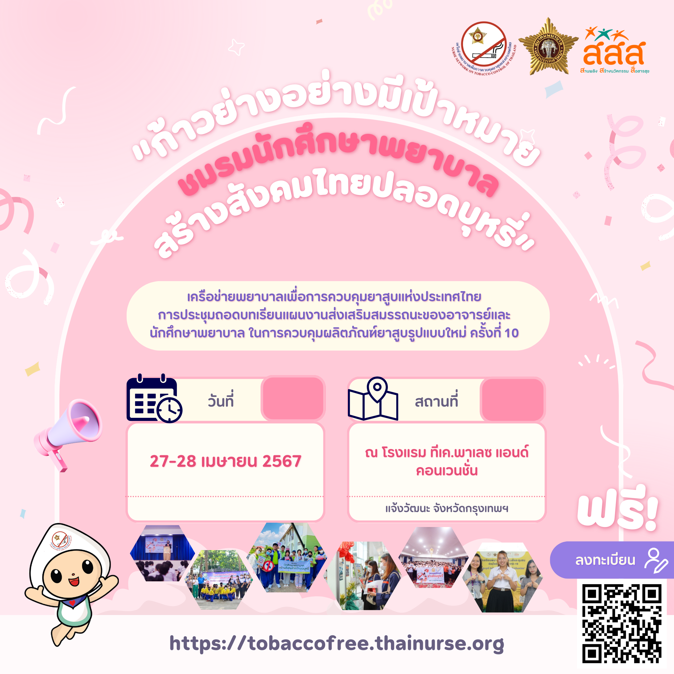 การประชุมถอดบทเรียนแผนงานส่งเสริมสมรรถนะของอาจารย์และนักศึกษาพยาบาล ในการควบคุมผลิตภัณฑ์ยาสูบรูปแบบใหม่ ครั้งที่ 10 เรื่อง “ก้าวย่างอย่างมีเป้าหมาย: ชมรมนักศึกษาพยาบาล สร้างสังคมไทยปลอดบุหรี่” 27-28 เมษายน 2567 19/03/256709/09/2025admin adminข่าวประชาสัมพันธ์เครื่อข่ายพยาบาลเพื่อการควบคุมยาสูบแห่งประเทศไทย คลิกลงทะเบียน