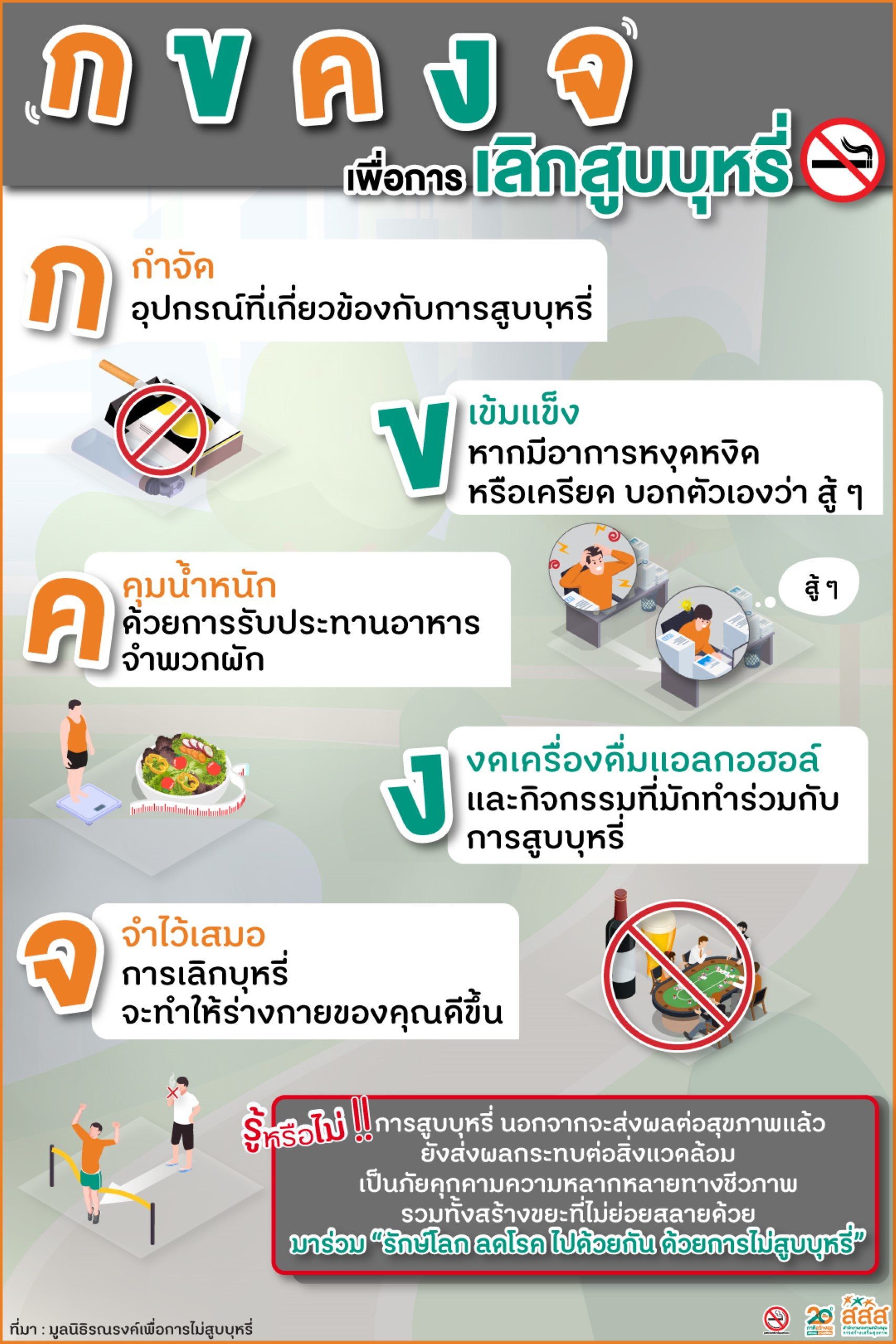 ก ข ค ง จ เพื่อการเลิกสูบบุหรี่ 07/06/256709/09/2025admin adminสาระน่ารู้เครื่อข่ายพยาบาลเพื่อการควบคุมยาสูบแห่งประเทศไทย ก ข ค ง จ เพื่อการเลิกสูบบุหรี่ ที่มา : มูลนิธิรณรงค์เพื่อการไม่สูบบุหรี่ , https://www.thaihealth.or.th/ก-ข-ค-ง-จ-เพื่อการเลิกสูบบ/