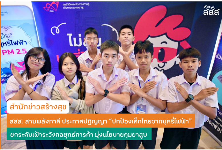 ศ.พญ.สมศรี เผ่าสวัสดิ์ ประธานสมาพันธ์เครือข่ายแห่งชาติเพื่อสังคมไทยปลอดบุหรี่ กล่าวว่า ขณะนี้การตลาดบุหรี่ไฟฟ้ามุ่งเป้าที่เด็กและเยาวชน ภาคีเครือข่ายควบคุมยาสูบทั้งหมดจึงเร่งขยายเครือข่ายครูและผู้ปกครองทั่วประเทศ เพื่อช่วยสร้างความรู้ และดูแลลูกหลานของเรา อีกทั้งฝ่ายปกครองและฝ่ายสาธารณสุขพร้อมช่วยกันตัดเส้นทางการกระจายบุหรี่ไฟฟ้าในจังหวัดต่างๆ ภาคีเครือข่ายควบคุมยาสูบทุกเครือข่ายมีแผนขับเคลื่อนในพื้นที่ของตนเพื่อปกป้องเด็กไทยจากบุหรี่ไฟฟ้า ซึ่งในฐานะผู้แทนจากภาคีเครือข่ายควบคุมยาสูบทั่วประเทศ ขอประกาศปฏิญญา สานพลังปกป้องเด็กไทยจากบุหรี่ไฟฟ้า ว่า 1. ขอเรียกร้องให้รัฐสภา ‘คงกฎหมายห้ามนำเข้าและห้ามขายบุหรี่ไฟฟ้า’ เพื่อคุ้มครองสุขภาพเด็ก และให้ความสำคัญกับอนาคตของชาติ มากกว่าผลกำไรและภาษี 2. ขอให้ทุกหน่วยงานที่เกี่ยวข้องบังคับใช้กฎหมาย ยกระดับการบังคับใช้กฎหมายให้มีประสิทธิภาพ จริงจัง เคร่งครัด และไม่เรียกรับผลประโยชน์ 3. จะเฝ้าระวัง เปิดโปงกลยุทธ์การตลาดของผู้ค้าบุหรี่ไฟฟ้าที่ทำการตลาดล่าเหยื่อมุ่งเป้าเยาวชน และกลยุทธ์การแทรกแซงนโยบายของเครือข่ายบุหรี่ไฟฟ้าผ่านองค์กร บุคคล สื่อ ให้สังคมรับรู้ 4. จะร่วมมือกันส่งเสริมให้การไม่สูบบุหรี่/บุหรี่ไฟฟ้า เป็นค่านิยมดูแลสุขภาพตนเองและผู้อื่น ทั้งนี้ ขอเชิญชวนประชาชนทุกคนได้มาร่วมกันปกป้องเด็กและเยาวชนให้ห่างไกลบุหรี่ไฟฟ้า พบเห็นการกระทำความผิดเกี่ยวกับบุหรี่ไฟฟ้า โทร. 1166 สายด่วนสคบ. และ 1599 สายด่วนตำรวจ