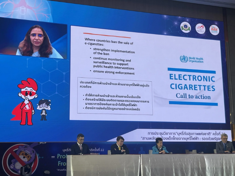 ดร.จักดิช เคอร์ ผู้เชี่ยวชาญระดับภูมิภาคด้านการควบคุมยาสูบ (Dr.Jagdish Kaur, Regional Advisor (Tobacco-Free Initiative) องค์การอนามัยโลกประจำภูมิภาคเอเชียใต้และตะวันออก กล่าวว่า บุหรี่ไฟฟ้ามีนิโคตินที่มีฤทธิ์เสพติดรุนแรงและอันตรายต่อสุขภาพ ไอบุหรี่ไฟฟ้าไม่ปลอดภัยและมีสารเคมีอันตราย ซึ่งอุตสาหกรรมบุหรี่ไฟฟ้ามุ่งเป้าทำการตลาดกับคนรุ่นใหม่ พัฒนาบุหรี่ไฟฟ้าให้มีรสชาติมากกว่า 1,000 กลิ่น เพื่อดึงดูดเด็กและเยาวชน ทุกประเทศควรดำเนินการอย่างเข้มงวดในการลดการใช้บุหรี่ไฟฟ้า โดยการบังคับใช้กฎหมาย/ระเบียบต่างๆ และพัฒนานโยบายที่เหมาะสม ดังนั้น WHO จึงสนับสนุนประเทศไทยคงกฎหมายห้ามนำเข้าและห้ามขายบุหรี่ไฟฟ้า เพื่อปกป้องเด็กและเยาวชนจากบุหรี่ไฟฟ้า