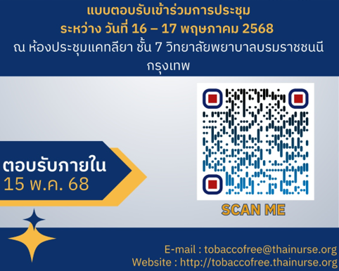 ตามที่ท่านได้ลงทะเบียนเข้าร่วมประชุมวิชาการวันพยาบาลสากล และความสำเร็จในการควบคุมยาสูบโดยพยาบาล พ.ศ.2568 เรื่อง “พยาบาลขับเคลื่อนสังคมปลอดบุหรี่เพื่อสุขภาพและเศรษฐกิจ”