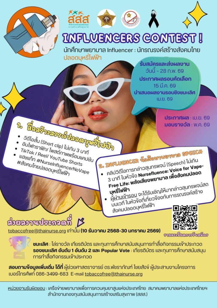 Influencer : นักรณรงค์สร้างสังคมไทยปลอดบุหรี่ไฟฟ้า 19/01/256903/02/2026admin adminข่าวประชาสัมพันธ์เครื่อข่ายพยาบาลเพื่อการควบคุมยาสูบแห่งประเทศไทย
