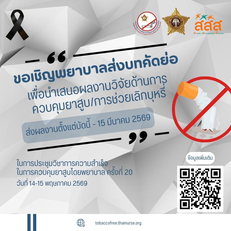 ขอเชิญพยาบาลส่งบทคัดย่อ เพื่อนำเสนอผลงานวิจัยด้านการควบคุมยาสูบ/การช่วยเลิกบุหรี่ 06/02/256906/02/2026admin adminข่าวประชาสัมพันธ์เครื่อข่ายพยาบาลเพื่อการควบคุมยาสูบแห่งประเทศไทย โหลดเอกสารโครงการ